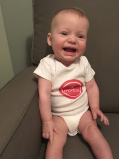 make the switch in the next few days. Thanks to our wonderful friends and family, we have yet to buy any diapers. My stockpile goes all the way to size 4; what a blessing!The week has included more jumping in her exersaucer, pants-less walks with Grammy [correction: pants for Grammy, but no pants for Em!], and scooting and rolling around during play time. For the first time this week, Em rolled onto her belly during nap time. I had just put Em in her crib, and I was surprised to look at the monitor and see her on her tummy. Since I usually put her down when she is still somewhat awake, I suppose it was her way of telling me that she wasn't quite ready to nap. Just like a turtle turned on its shell, she didn't seem to know what to do. I quietly snuck back in to her room and gently turned her over; I snuck back out again before she could figure out what had happened. I haven't caught her actually sleeping on her belly yet; her favorite pose is on her back with one hand resting up by her face. She looks so precious while she is sleeping. As I write this, she has been asleep for about 30 minutes. Daddy is at school this evening for baseball, softball, and soccer games, and hopefully he will be home soon. I also had a later evening after an event we had on campus today for high school juniors. It has been a busy week, so I am hoping that we all catch some zzz's this weekend!