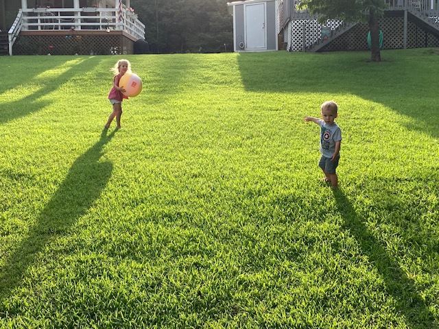 One funny moment from this past week, Emmy had one of her dolls under her shirt, and I asked her what she was doing. She said: "Baby is drinking milk from my skin like when Eli drank milk from your skin." She doesn't quite know the names for all the female anatomy, and I just giggled as she explained the process of breastfeeding in her own terms. It has been several months since I stopped breastfeeding, so it is funny that I caught her imitating me now. She was even sitting in my chair where I would often sit. We just returned home after spending the weekend at the lake. With the 4th of July falling on a Sunday, Boomer had a long weekend with both Friday and Monday off, so we left mid-morning on Friday. On our way there, we stopped for lunch at a local restaurant called Lefler's Place. The half rack of ribs was a huge hit with both of my boys. Ribs are one of Boomer's favorites, and it just so happened to be the Friday special. After filling our bellies, we drove the last few miles to the lake and spent the afternoon outside playing in the yard and on the dock. On Saturday, Goosie, Darby, and their crew arrived around lunchtime. Emmy loved jumping on the large floating lily pad with her cousins, while Eli entertained himself by splashing around in the baby pool. The 4th of July parade was in the afternoon, so we took a break from the water to see the fire trucks and golf carts. Later that evening, we went out on the water to see the fireworks. It was Emmy's first time seeing the fireworks at the lake since we have usually stayed back at the house for bedtime. After watching the fireworks, she feel asleep during the short boat ride back to the house. All of the kids were pretty tired, as were the adults, so it was lights out right away. Today we played outside again for almost the whole day. Lake days are like that: we all head outside right after breakfast, and we are either on the deck, the dock, or the boat until sundown. We are back in Kernersville now and looking forward to the day off with Daddy tomorrow. Hopefully the day starts with everyone sleeping in!