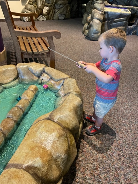 The summer days continue to fly by! On Monday, I went to school for a meeting which lasted most of the morning. Grammy watched Emmy and Eli, and I arrived home during naptime in the afternoon. I didn't mind going in to work for just a few hours, knowing that I would then resume my summer activities. I was glad to be back with the kiddos in my t-shirts and gym shorts for the rest of the week. On Tuesday, we got our third use out of the library pass to the Kaleideum. This time we went to the other location that used to be called SciWorks, which has an outdoor portion, as well as other indoor exhibits. Our friends Ashley, Harrison, and Griffin joined us. Eli loved fishing, and I showed tremendous growth by letting the kids play in the sand pit :) On Wednesday, we went to the park, and then on Thursday, the YMCA pool. I had trouble convincing Eli to come into the water, but Aunt Megan had the magic touch - not only did she get Eli in the water, but he even jumped off the side over and over again. Also, both kiddos tried the lily pads for the first time, again with Aunt Megan's special coaxing. Both of her boys are such strong swimmers, and it is so nice of her to help out with my little ones. It takes a village!
