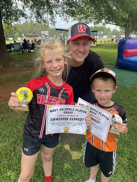 This past week also brought the ending of the regular season for t-ball and softball. Eli's team had a party on Saturday to celebrate, and then they played their last game after that. While Eli's season is over, Emmy is continuing to play for a couple more weeks. She attended a softball camp at Forbush at the end of last week, and she is practicing with the All-Stars for their upcoming tournament. At the WLL Closing Ceremony today, the All-Star team was announced, as well as other special recognitions like Most Improved, Coach's Award, and Most Valuable Player. Both Emmy and Eli received MVP, which was an award voted on by their teammates. On the way home, both kids asked what MVP means, and it was actually pretty sweet that they did not know what it was. We explained that they contributed positively to their team's success throughout the season. Boomer and I are very proud of them for their consistent effort and desire to improve. As we get ready for our first full week of summer, I am excited about the days ahead. We have lots of fun adventures in store!